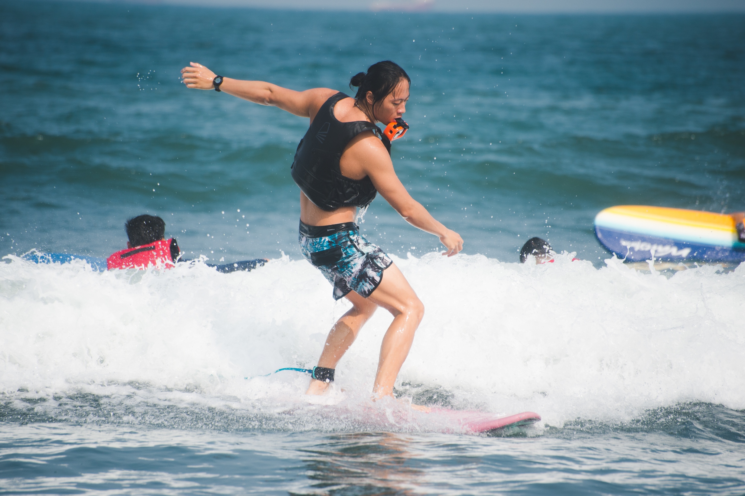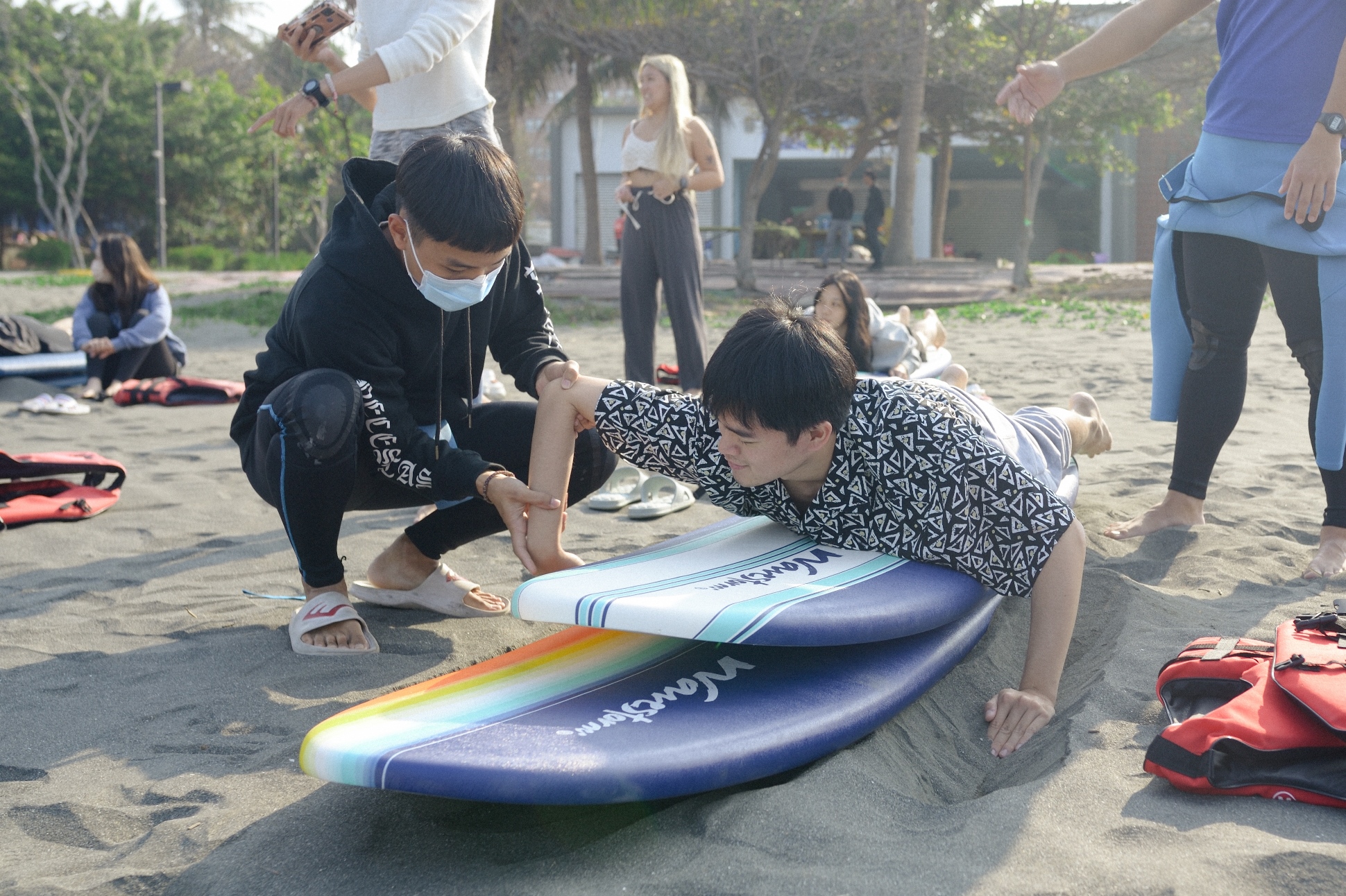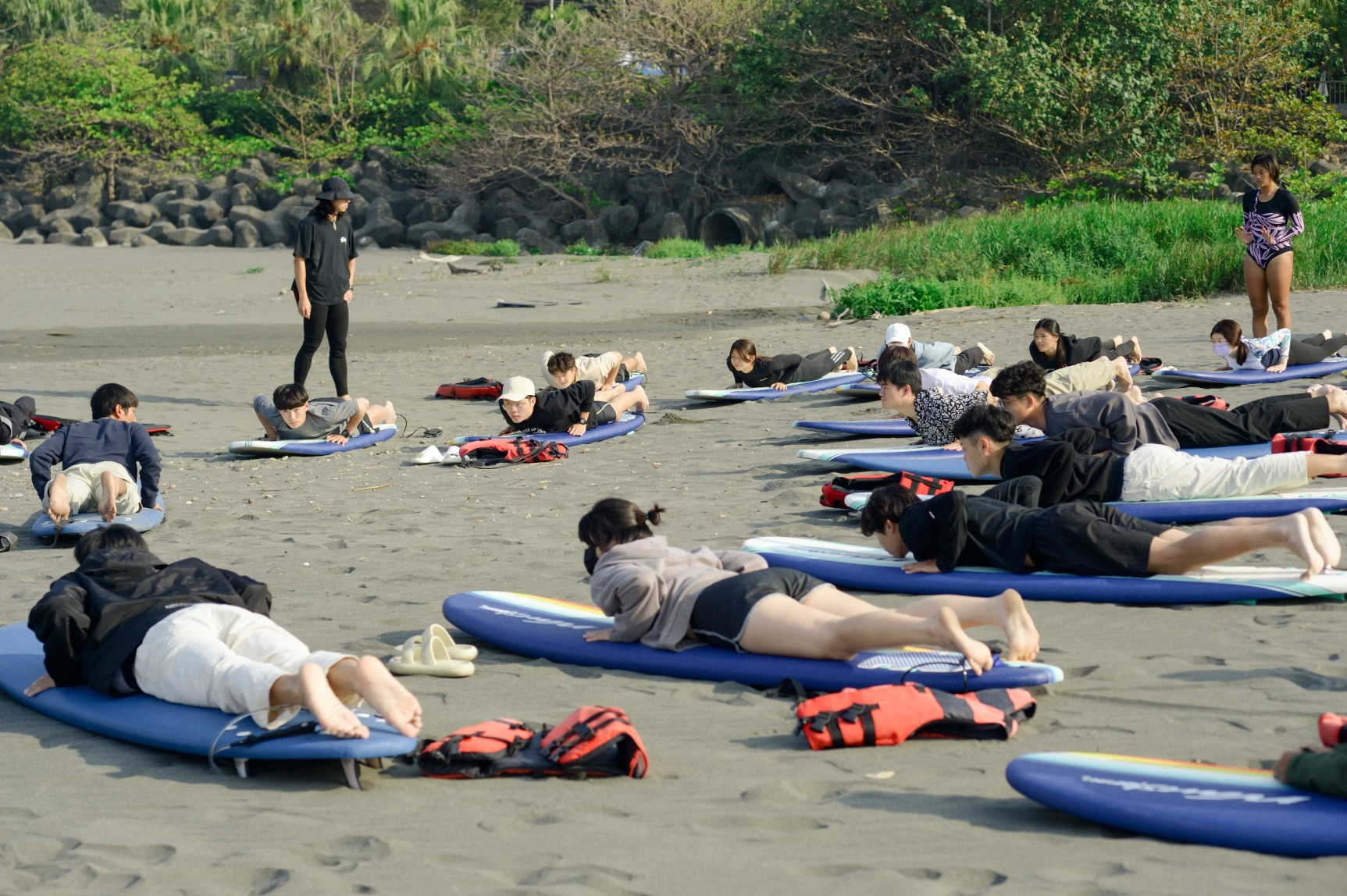 課程細節方面,蔡睿洋強調尤為注重水上安全,初期教導正確使用魚雷浮標、趴板划水、起乘姿勢、上岸召回信號以及危機處理等內容,另也安排游泳能力訓練,確保學生泳力與體力。在學生正式下水前,會由教師先示範衝浪板上的滑水動作及起乘姿勢,在分解步驟並逐一講解各步驟的細節後,帶領學生在岸上進行演練,課程助教會在一旁協助修正動作,經反覆練習和充分暖身後,才正式實際下水操作。
