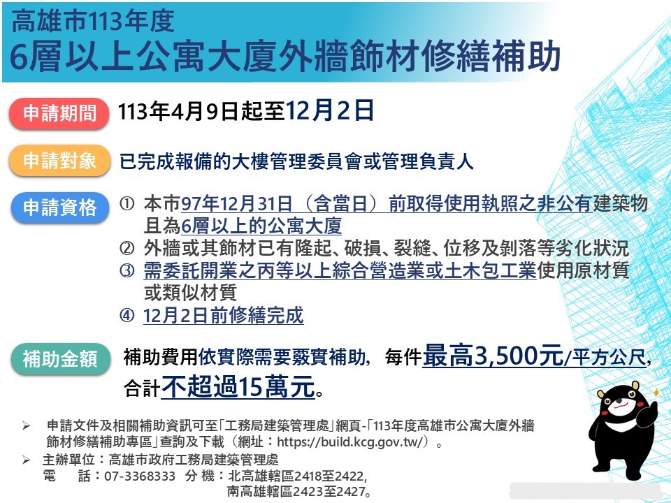 為提升住宅大樓外牆飾材安全,高市府工務局今年首次辧理「6層以上公寓大廈外牆飾材修繕補助」,只要在113年12月2日受理截止前,提出申請並修繕完成,每件每平方公尺最高補助3,500元且合計不超過15萬元為限。歡迎符合資格的大樓管委會或管理負責人把握機會踴躍申請。