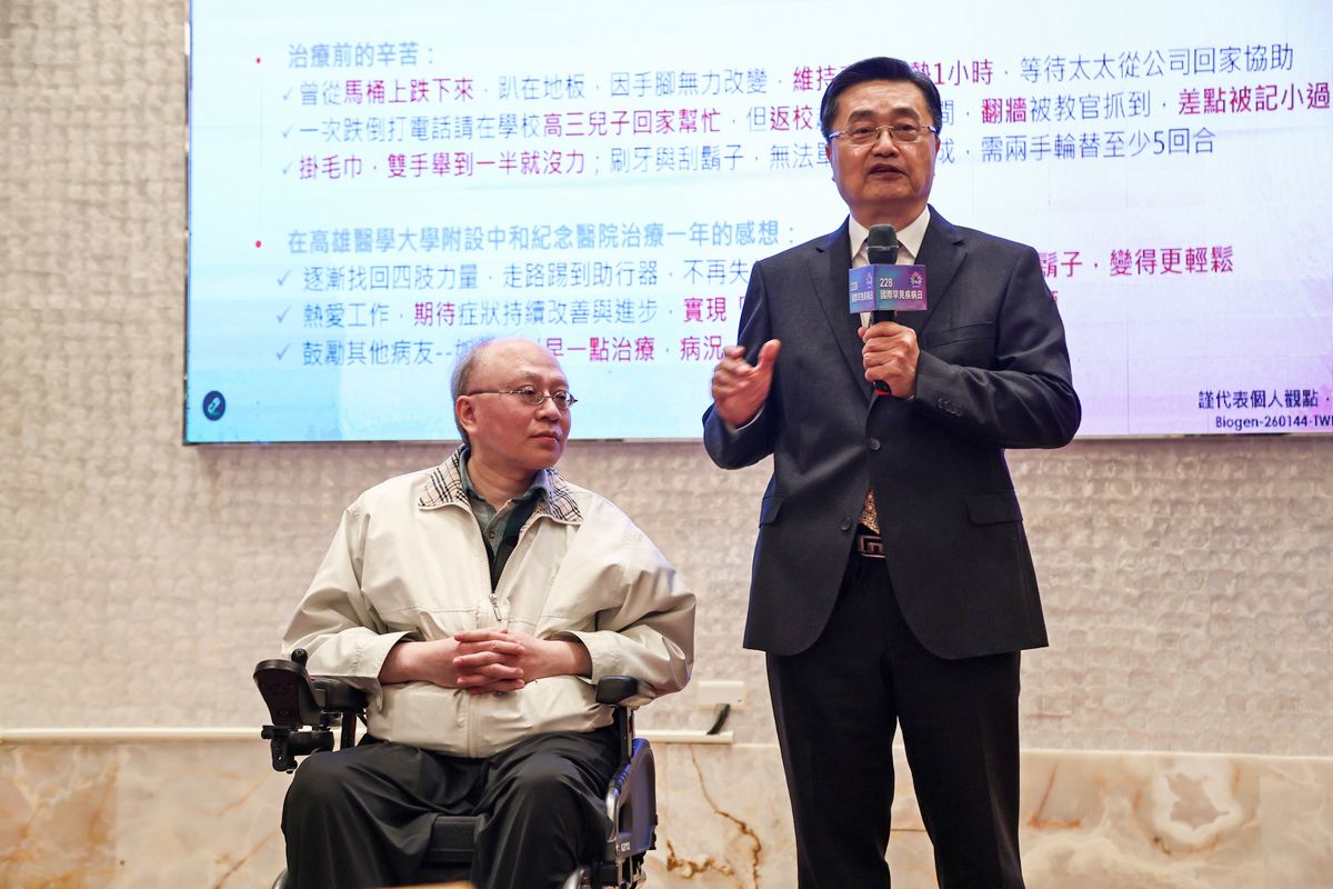 今年55歲的工程師王程麒,曾負責政府大型專案,且申請到上億元研發經費,雖在3歲前步態不穩容易跌倒,運動功能較同儕落後,直到41歲才確診「脊髓性肌肉萎縮症」。歷經從馬桶跌下來,手腳無力,維持青蛙趴地姿勢長達一小時的窘境,也曾在9年內發生6次重大跌倒骨折,左大腿、左小腿、左肩膀與右腳踝都摔斷過,嚴重影響生活品質。王先生苦等治療多年,終於在去年初在高醫團隊的協助下,接受健保藥物治療,搭配醫囑規律復健,力量的回歸一點一滴,日積月累,一年間不再摔倒,生活改善有感,期待病況持續進步,有朝一日能實現工作到生命終了的心願。