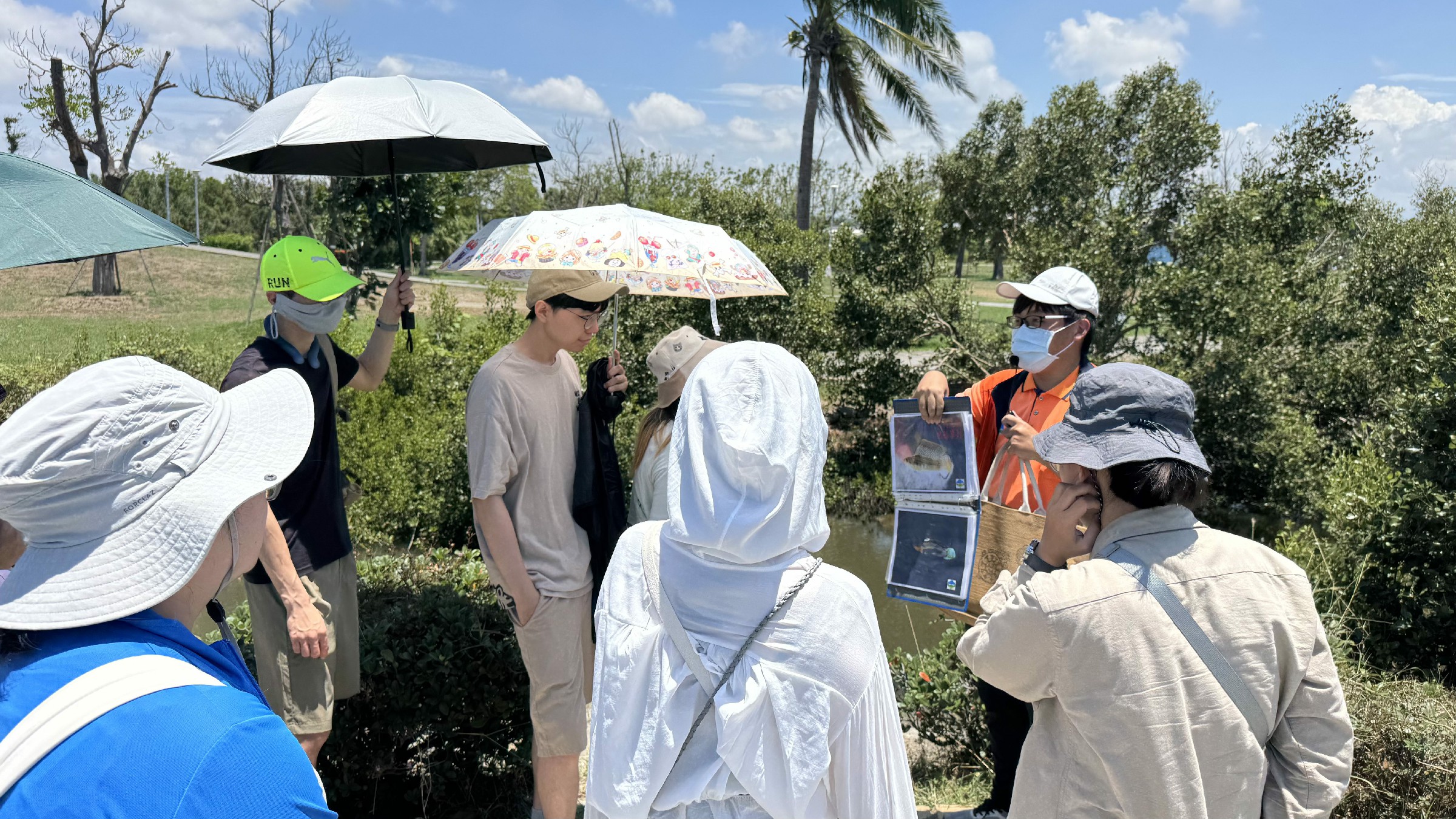 本次探險之旅由林園愛鄉協會前理事長陳俊強領路,穿梭於林園海洋濕地公園的木棧步道,觀察紅樹林胎生苗的生命奇蹟,並近距離觀察濕地特有的「倒立水母」,體會濕地系統的生態多樣性。陳俊強指出,這片濕地不僅是生物棲息的重要棧橋,更是在地居民與自然共生的象徵,肩負起教育與保育的雙重使命。