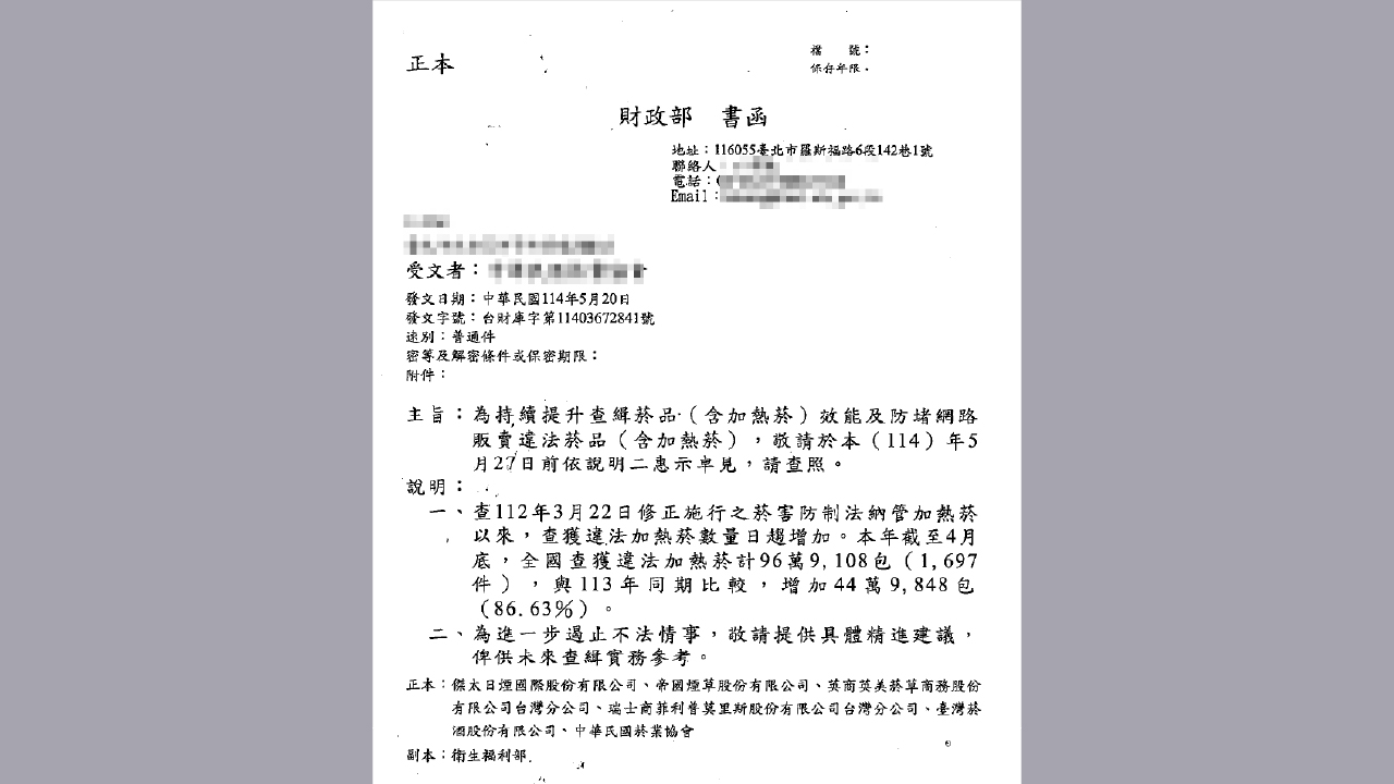 衛福部一再拖延,另一菸品主管機關財政部近日則是有所動作。據了解,為查緝愈來愈嚴重的走私加熱菸,財政部於今年5月20日賴政府就職週年,發函給中華民國菸業協會及國內外5大菸商,詢問對於私菸走私泛濫有何實務建議解決方法,並將副本知會負責加熱菸健康風險評估審查作業的衛福部。
