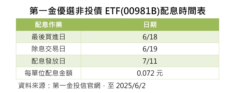 第一金優選非投債ETF(00981B)6月配息初估出爐,第一金投信預計每單位配發0.072元,維持上個月的配息水準不變,除息交易日是6月19日,想要參與此次除息的投資人,最後買進日是18日,配息發放日訂於7月11日。