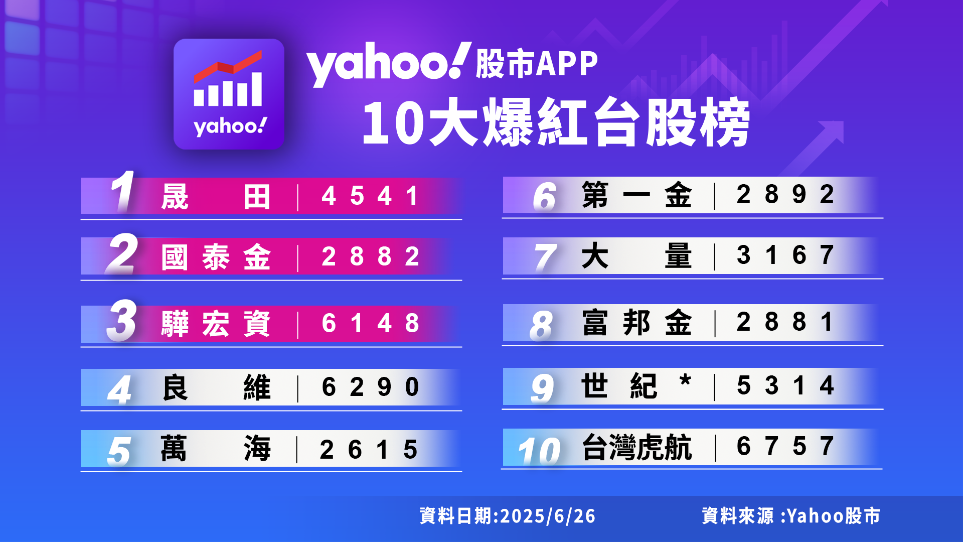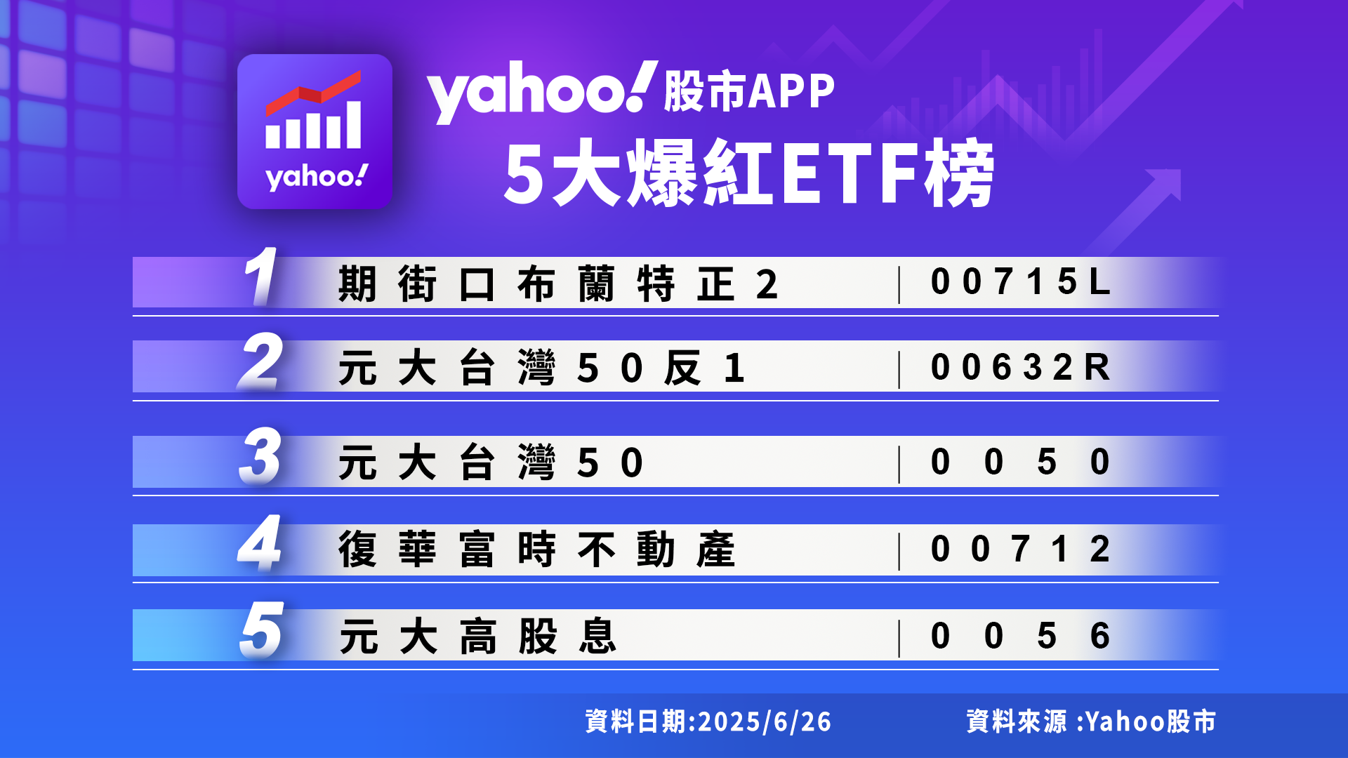 Yahoo股市App今(26)日公布第二季「十大爆紅台股榜」與「五大爆紅ETF榜」,前者,由軍工題材股「晟田」拿下榜首,國泰金、第一金、富邦金也同時登榜;至於五大爆紅ETF榜,則由「期街口布蘭特正2」(00715L)奪冠,另外,元大台灣50反11(00632R),以及老字號的元大台灣50(0050)、元大高股息(0056)也都上榜。