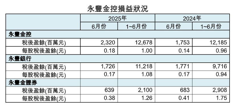 主要子公司永豐銀行6月稅後盈餘17.26億元,累計上半年稅後盈餘112.18億元;永豐金證券6月稅後盈餘6.39億元,累計上半年稅後盈餘21億元。