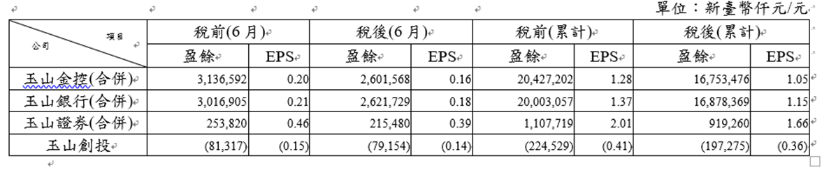 主要子公司玉山銀行累計上半年稅後盈餘168.8億元,年增45.79%,稅後EPS為1.15元;玉山證券上半年獲利9.2億元,稅後EPS為1.66元;玉山創投上半年稅後虧損2億元。