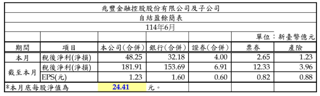 兆豐金6月稅後獲利48.25億元,年增38.8%,月增51.5%,上半年稅後EPS為1.23元,去年同期則為1.42元。