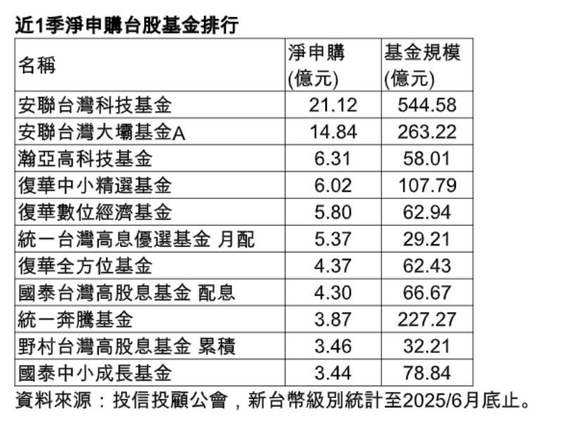 關稅利空逐漸淡化,激勵資金回流台股基金,近1季規模成長近2成,優於整體境內基金表現,其中有23檔基金淨申購逾億元,包括復華、安聯、統一、國泰、野村、瀚亞等旗下招牌基金。