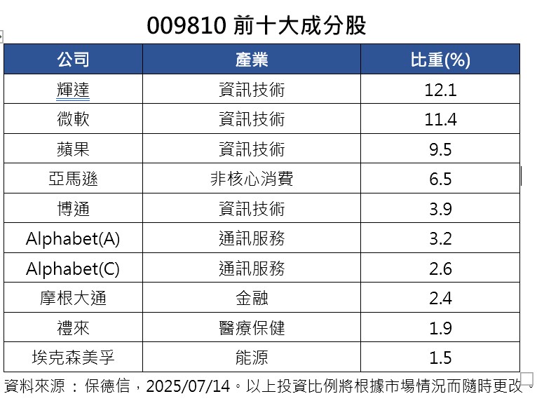 009810前十大成分股包括輝達(12.1%)、微軟(11.4%)、蘋果(9.5%)、亞馬遜(6.5%)、博通(3.9%)、Alphabet(A)(3.2%)、Alphabet(C)(2.6%)、摩根大通(2.4%)、禮來(1.9%)、埃克森美孚(1.5%),國家布局分布以北美77.7%為主,歐洲14.5%第二,新興市場配置1.2%,現金與其他約6.6%。