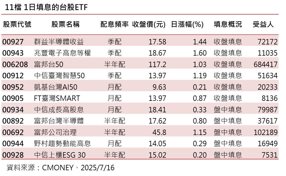 今日除息的台股ETF,也有11檔完成填息,包括006208富邦台50、00692富邦公司治理、00892富邦臺灣半導體、00905 FT臺灣Smart、00912中信臺灣智慧50、00927群益半導體收益、00928中信上櫃ESG30、00934中信成長高股息、00943兆豐電子高息等權、00944野村趨勢動能高息、00952凱基臺灣AI50。