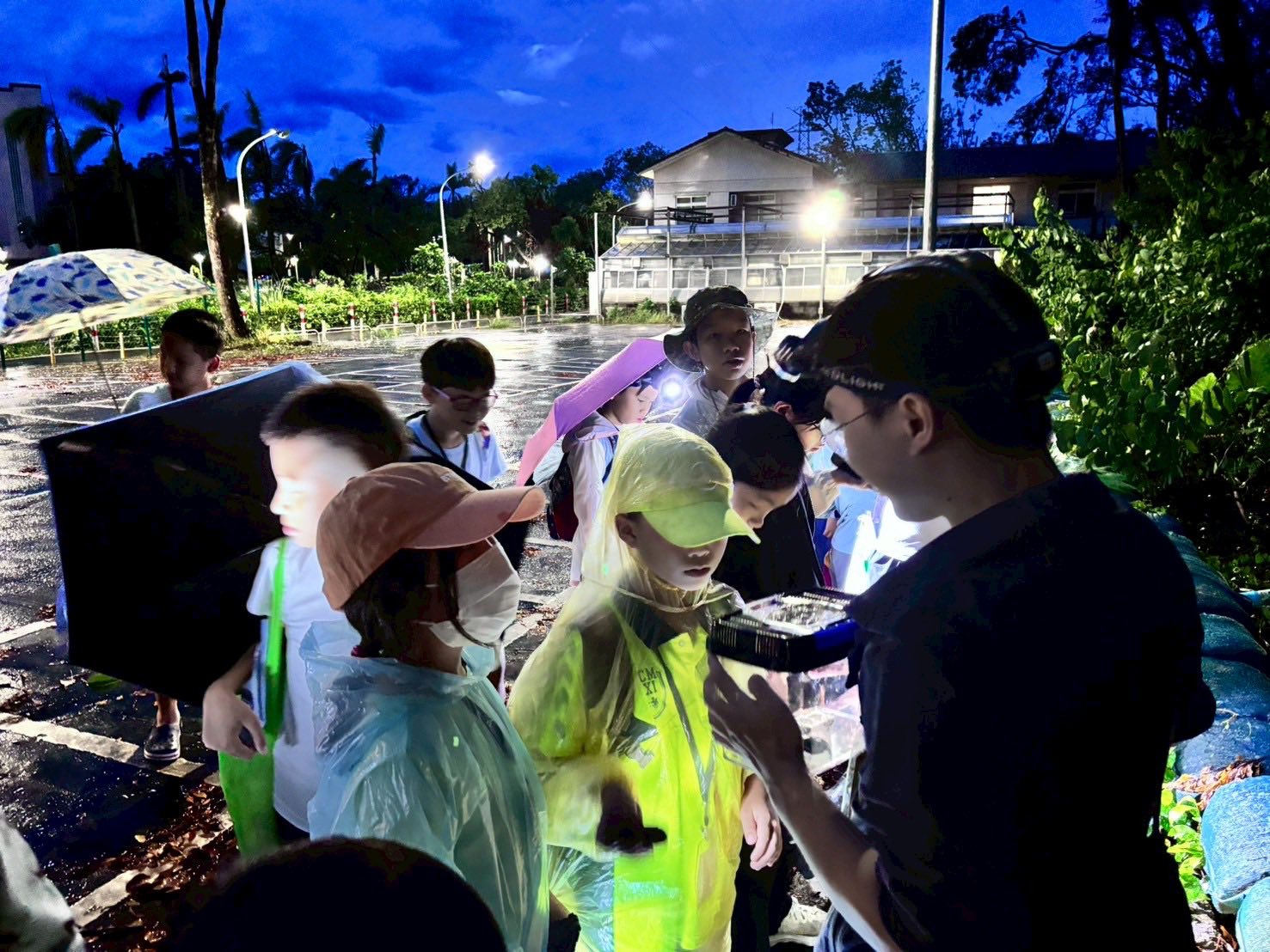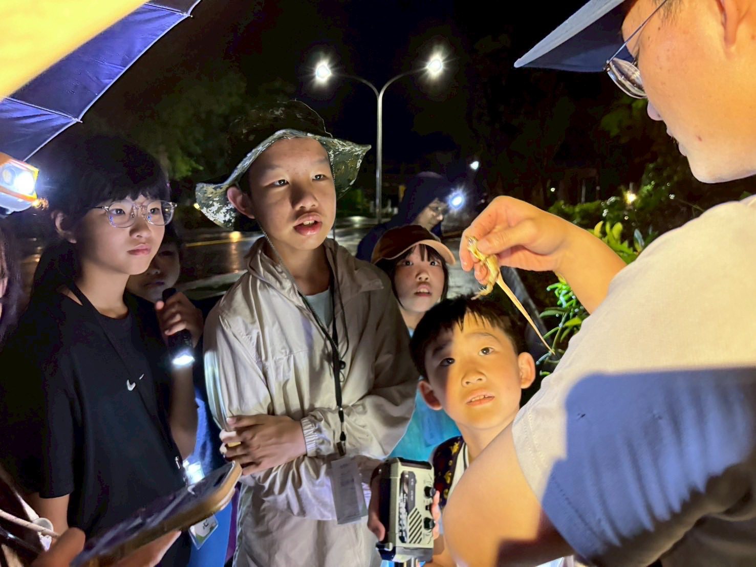 此次生態營聚焦嘉義在地的特有物種──諸羅樹蛙,結合生態教育、手作體驗與夜間實察,設計出一系列貼近自然且富有啟發性的課程。雖然受到颱風攪局,原訂戶外課程部分臨時調整為室內進行,但不減學員學習熱情。在細雨紛飛的夜晚,學員們依然於嘉義大學蘭潭校區展開夜觀行程,頭戴手電、靜聽蛙鳴,在濕潤林地間搜尋青蛙蹤跡,首次體驗雨中「與蛙對話」的悸動與驚喜。對多數孩子而言,這樣的經歷彌足珍貴,也將成為生命中難忘的自然記憶。