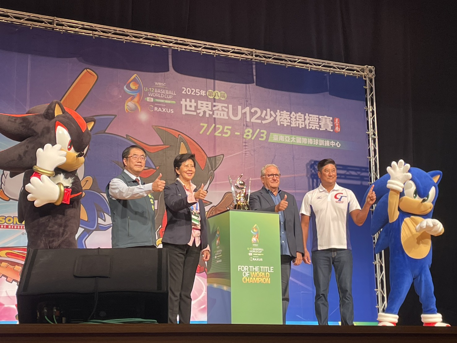 圖說:台南市長黃偉哲(左一)世界棒壘球總會秘書長劉明珠(左二)、世界棒壘球總會會長Riccardo Fraccari(右二)、中華棒協理事長辜仲諒(右一) 與Sonic與Shadow吉祥物合影,為U12賽事揭開序幕 (圖片來源/記者林薇安攝)