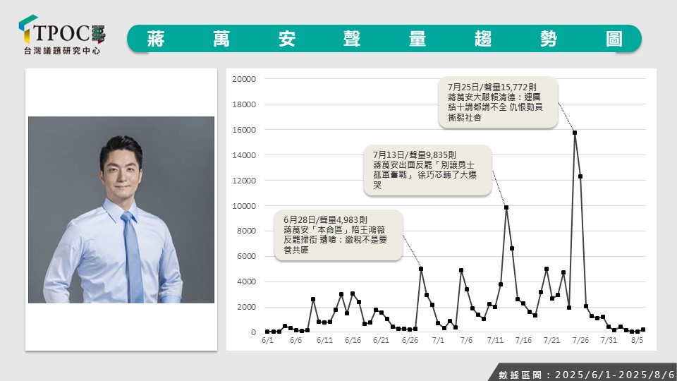 台北市長蔣萬安的聲量穩居第二。6月28日,蔣萬安陪同立委王鴻薇掃街反罷時遭民眾嗆聲「繳稅不是要養共匪」,引發網路熱議。對此,不少網友反擊「繳稅也不是為了養綠共」,各陣營支持者在網路上爆發激烈交鋒。7月13日,蔣萬安與多位藍營要角出席反罷造勢活動,為徐巧芯、王鴻薇等人站台,高喊「別讓勇士孤軍奮戰」,現場氣氛熱烈使徐巧芯落淚,再獲支持者力挺。選前之夜(7月25日),蔣萬安於凱道再度明確表態,批評「票投不同意就是教訓賴清德」,並酸賴「說要團結,但連團結十講都講不全」,發言一出引發現場譁然,聲量快速推升。