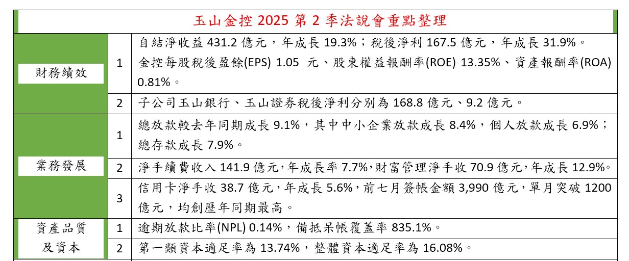 不過,黃男州說,還是要看下半年整體大環境變化,因為上半年台灣景氣相當好,經濟成長率6.67%,是非常好的半年,下半年預估受對等關稅影響,與232法案的不確定性,經濟成長遠不如上半年,對金融業包括玉山也是挑戰,玉山希望今年獲利成長率能表現不錯,會努力創新高,往此方向邁進。