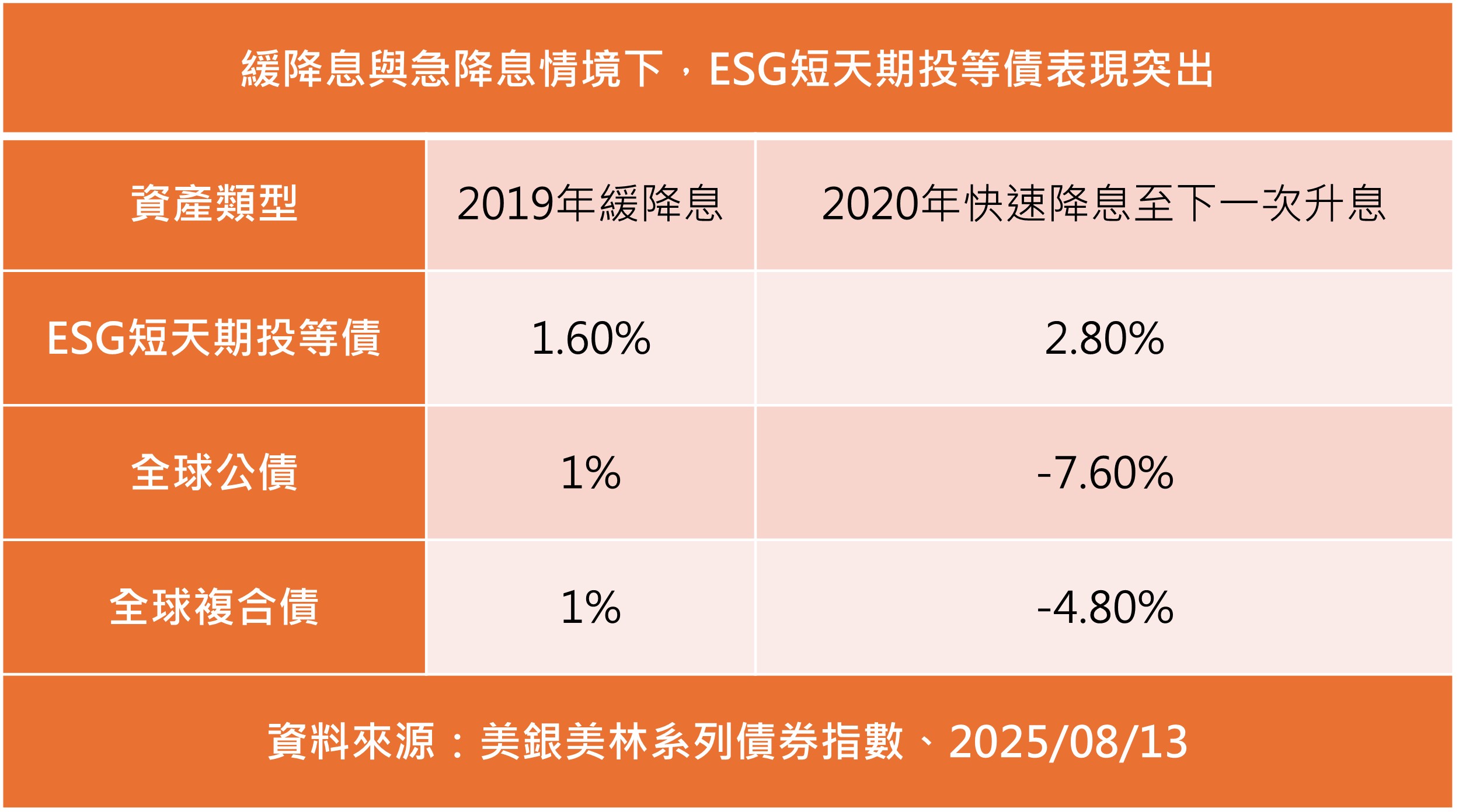 群益投信債券ETF研究團隊表示,短天期債的波動較小,但在降息時同樣也能受惠,回顧2019年降息循環,於2019/7/31至2019/10/30的緩降息期間,ESG短天期投等債指數上漲1.6%,表現較全球公債與全球複合債更佳,而在後續2020/3/至2022/3/16的快速降息至下一次升息之期間表現,相較全球公債與全球複合債表現承壓,ESG短天期投等債仍守住正報酬,上漲2.8%,可見在不同降息步調下,短天期債都能發揮穩健特性。