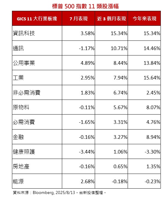 科技股成領頭羊,今年來標普500指數11個類股當中,工業類股、資訊科技股大漲逾15%領先,僅健康照護、能源類股走跌。