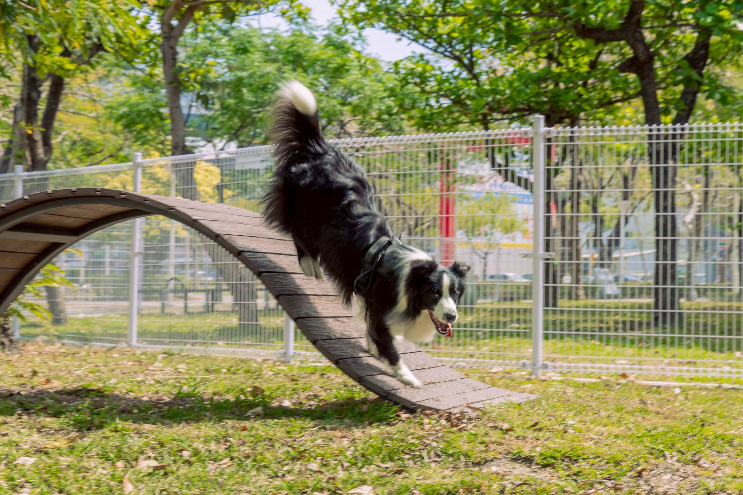 ↑圖說:岡山公園寵物活動區提供寬闊奔跑空間與狗狗專屬遊具。(圖片來源:高雄市工務局提供)