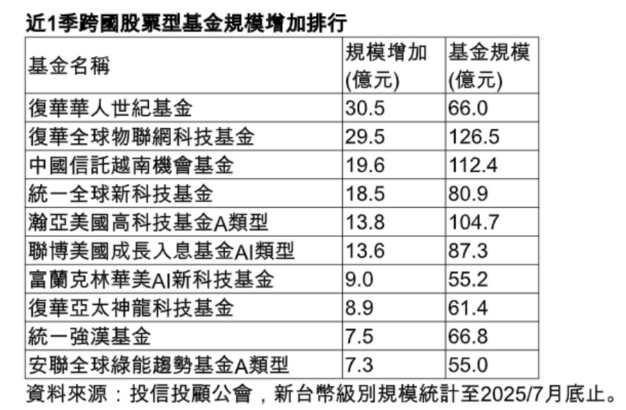 其中,復華華人世紀、復華全球物聯網科技、統一全球新科技、瀚亞美國高科技、聯博美國成長入息等基金,都有逾10億元的規模增長;中國信託越南機會、統一強漢基金,則在越南及大中華股市近期翻揚帶動下,規模也有增長。