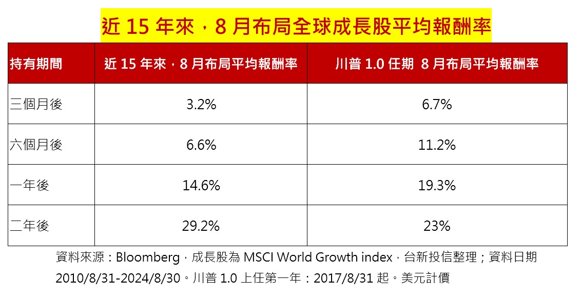 另外,近15年來,若每年8月布局全球成長股,一年及二年後的平均報酬率分別接近2成及3成,顯示8月是進場布局全球成長股絕佳時機。