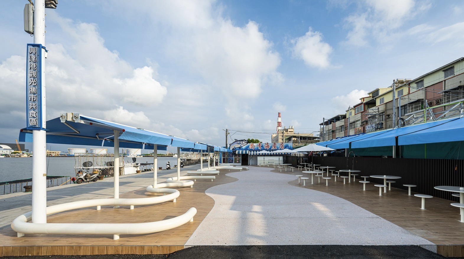 圖說:興達港觀光漁市整體硬體改造以「港邊藍」為核心概念,打造市場嶄新入口意象。(圖片來源:高雄市經發局提供)