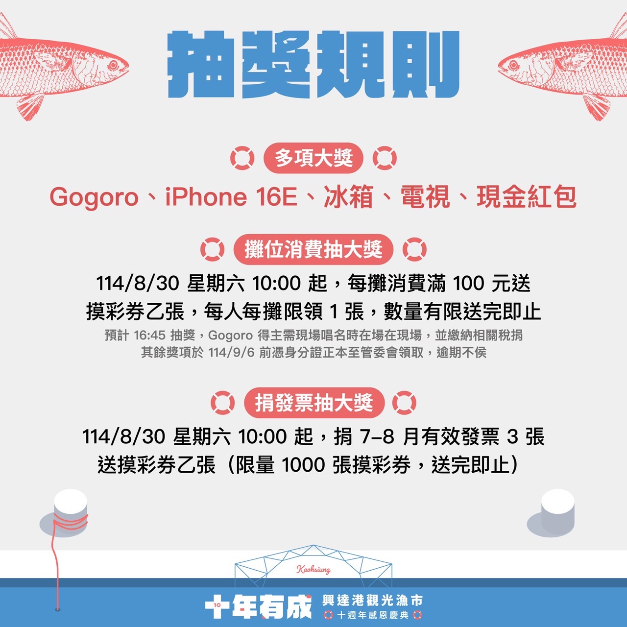 「興達港觀光漁市」總幹事鄭瑞益指出,感謝經濟部與經發局的大力支持,攤商們對市場煥然一新的面貌深感振奮,並以熱情贊助方式回饋給老顧客與新朋友,大力響應本次十週年活動。這次的活動亮點就是「消費滿百抽獎」,當天上午十點起來興達港超過百個攤位消費,滿一百元就送一張摸彩券,每人每攤限領一張。摸彩獎品包含Gogoro、iPhone 16E手機、家電與現金紅包等超過50組精彩大獎,總價值突破50萬元,活動更邀請林秀琪、七郎、謝金晶等知名台語歌手演出,搭配在地團體表演,並結合公益義剪及發票捐贈活動,讓慶典兼具熱鬧氛圍與愛心傳遞。