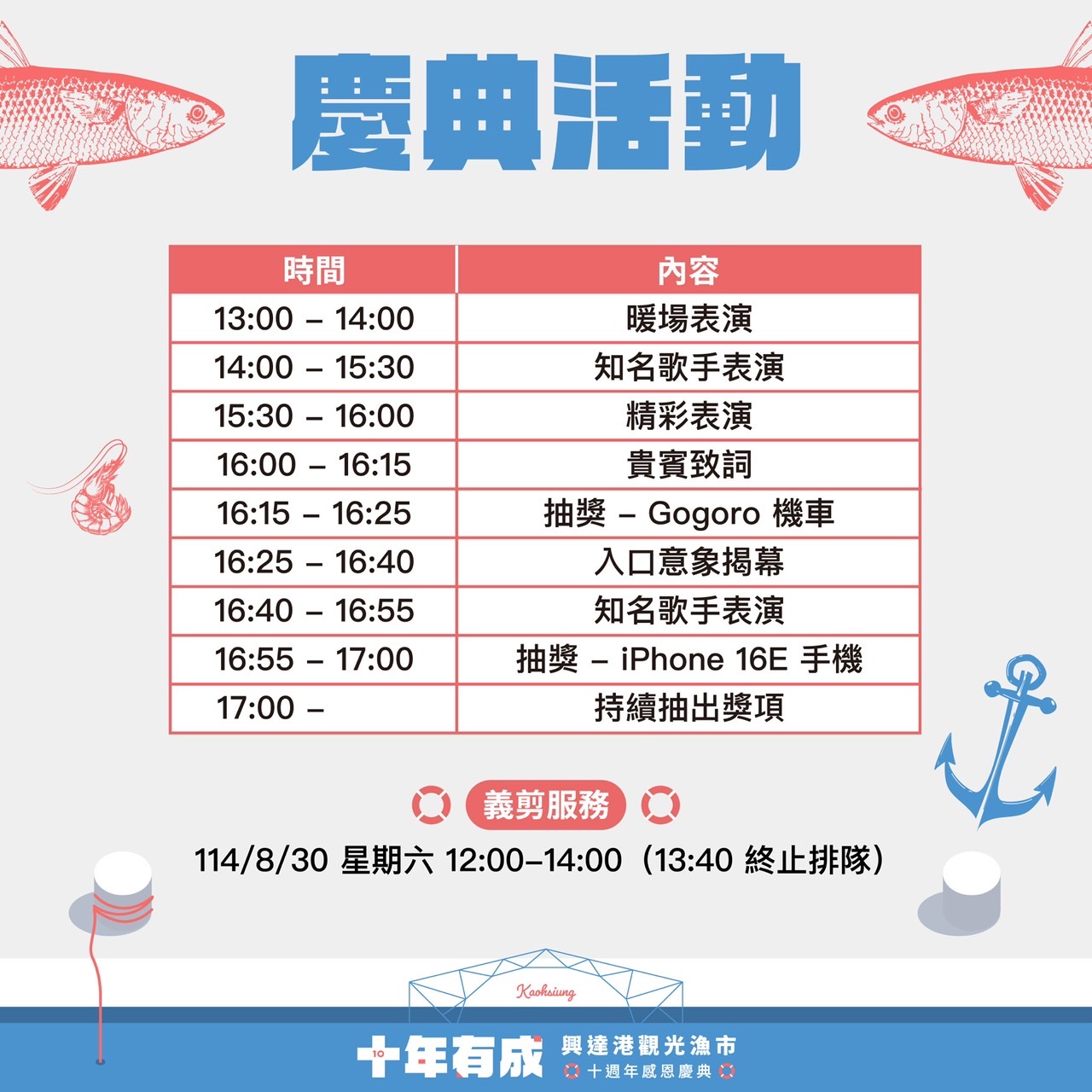 「興達港觀光漁市」成立至今邁入第十個年頭,場內販賣各式「現撈仔」漁獲,為北高雄熱門景點,今年更是在經濟部補助下完成市場改造工程,環境全面升級,管委會8月30日上午10時至下午5時將舉辦「興達港觀光漁市十週年感恩慶典」,正式揭幕入口意象,當日消費滿百即可參加摸彩,包含Gogoro、iPhone 16E、電冰箱等澎湃好禮現場抽,並邀請知名台語歌手精彩演出,熱情歡迎民眾共襄盛舉,品嚐新鮮海鮮與享受黃金夕陽。