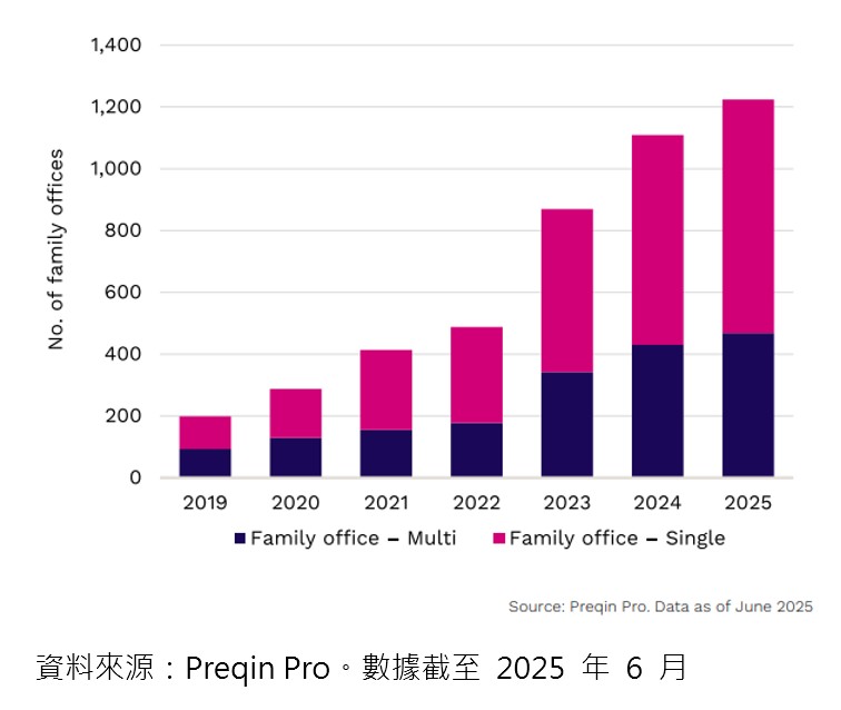 PREQIN公布的《2025年亞太區家族辦公室》報告顯示,自2019年以來,亞太地區的家族辦公室數量增長了六倍(如下圖)。2019年至2025年間,亞太地區家族辦公室在全球所佔的比例從17%上升至22%,預計到2030年將有高達5.8兆美元的跨代財富轉移。