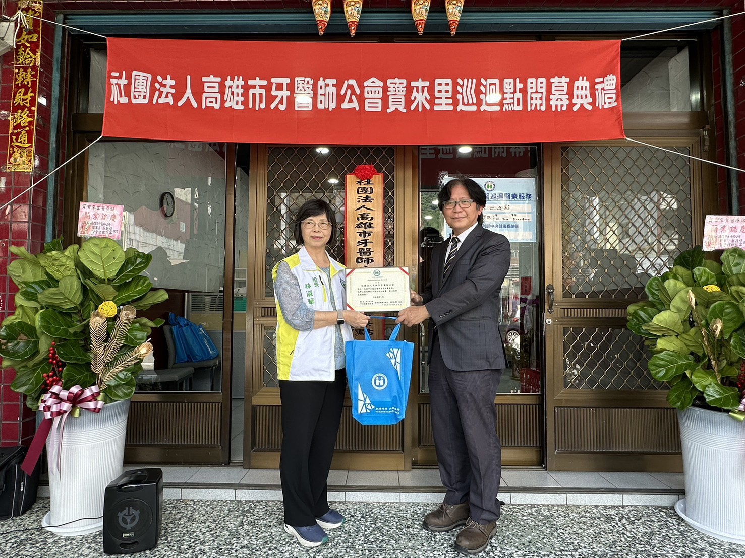↑圖說:健保署高屏業務組組長林淑華(左)、高雄市牙醫師公會理事長蔡政峰(右)出席開幕式。(圖片來源:高雄市牙醫師公會提供)