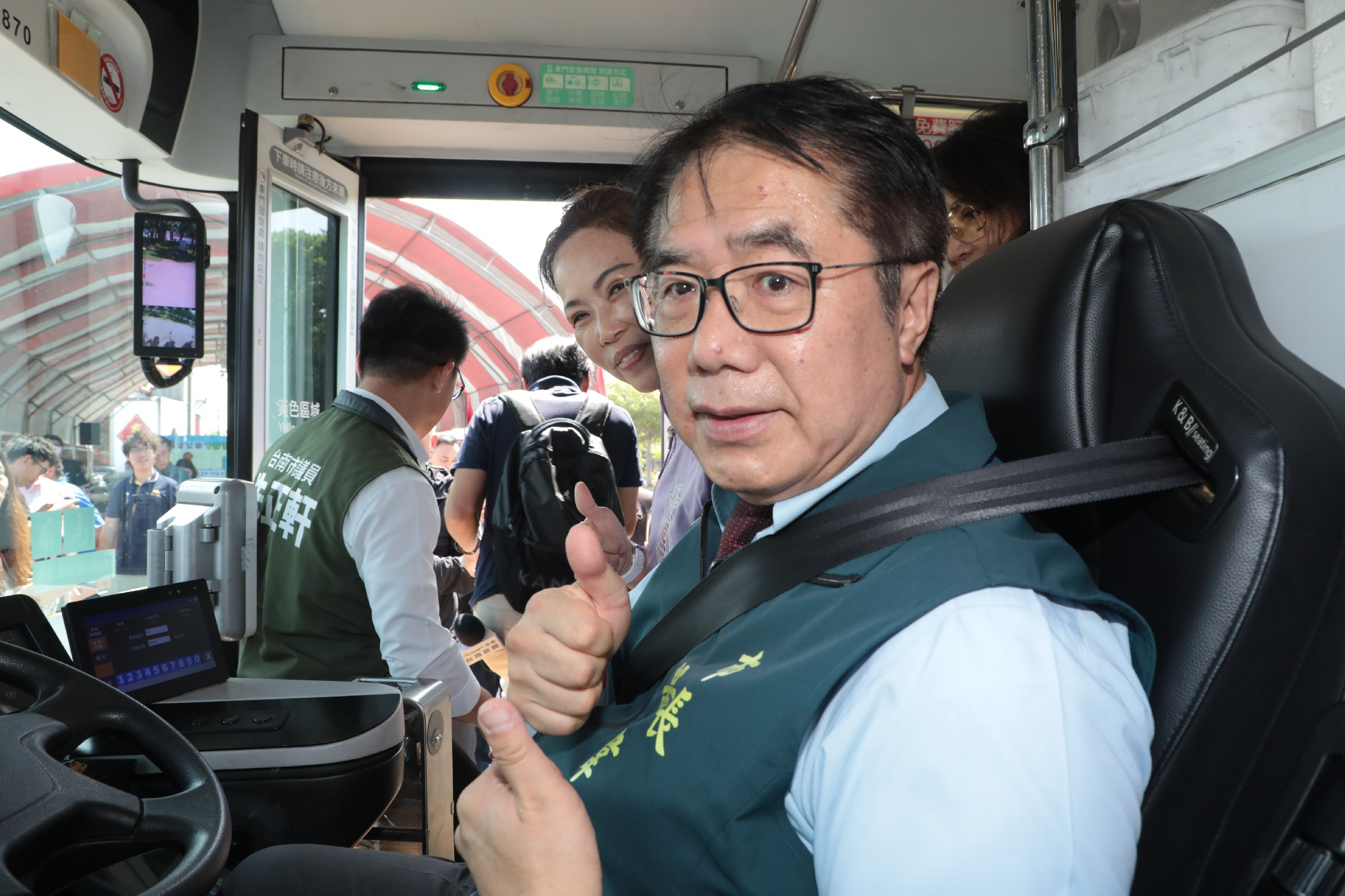 ↑圖說:臺南市長黃偉哲體驗車內設施,肯定大臺南公共運輸朝淨零邁進的努力(圖片來源:臺南市政府提供)