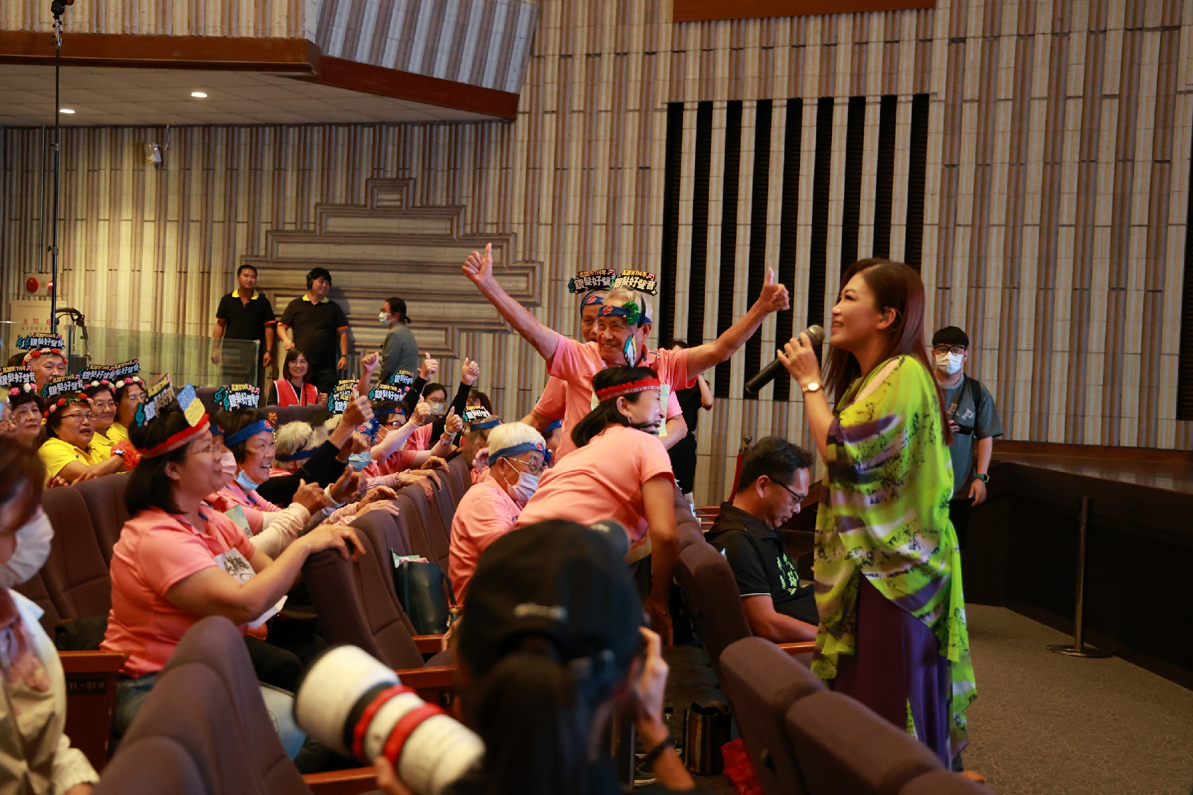 ↑圖說:銀髮好聲音歌唱大賽決賽邀請金曲天后黃妃擔任嘉賓,High翻全場。(圖片來源:高雄市社會局提供)