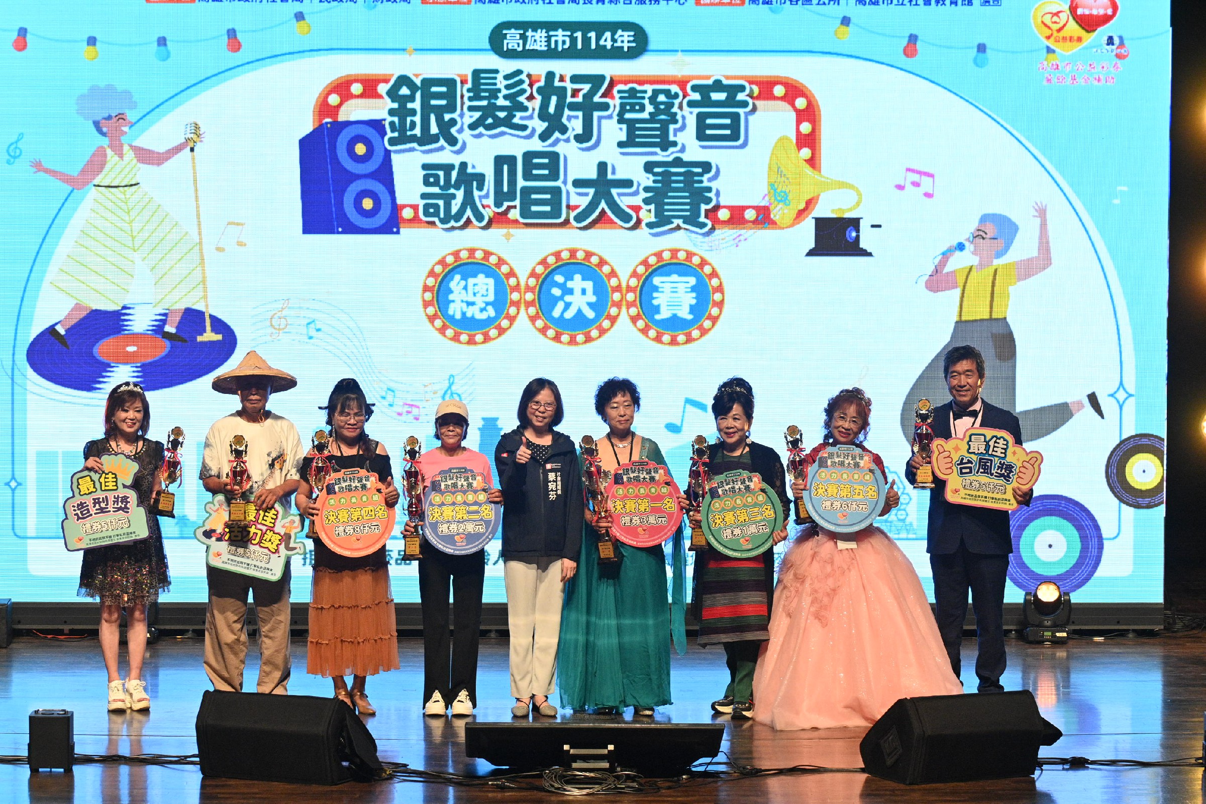 ↑圖說:銀髮好聲音歌唱大賽決賽活力長青組得獎者與社會局蔡宛芬局長(中)合照。(圖片來源:高雄市社會局提供)