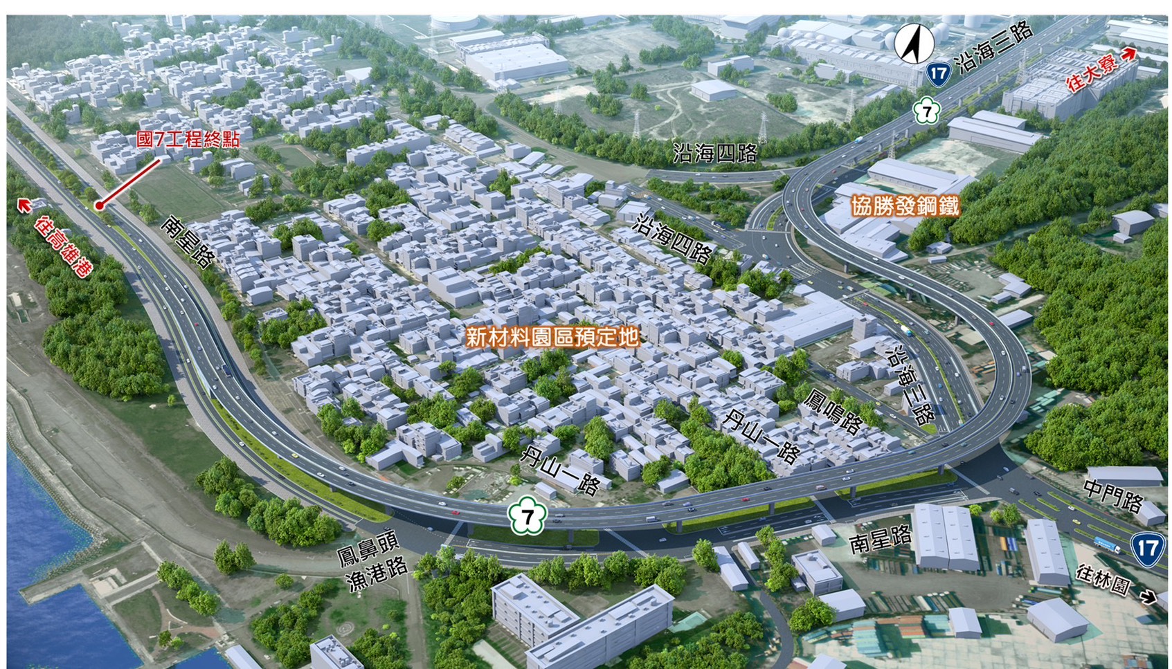 都發局強調,國道7號銜接和發園區、大發、林園工業區與小港貨櫃港,並串聯高雄半導體產業S廊帶,支援高雄科學園區與仁武產業園區上下游供應鏈,形成南部地區重要的產業運輸路廊,進一步提升南部產業升級及國家商港競爭力,全面促進高雄城市發展。