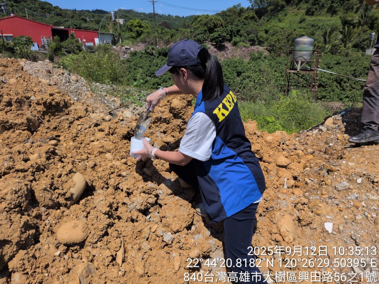 ↑圖說:高雄市環保局在大樹區田寮段農地發現非法堆置營建混合物,稽查人員進行現場採樣。(圖片來源:高雄市環保局提供)
