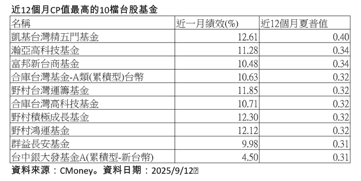 檢視近一年的台股基金,夏普值、也就是CP值最高的10檔,分別是凱基台灣精五門、瀚亞高科技、富邦新台商、合庫台灣基金-A類、野村台灣運籌、合庫台灣高科技、野村積極成長、野村鴻運、群益長安、台中銀大發基金A,top 9的近一個月報酬都有尬贏台股加權指數。