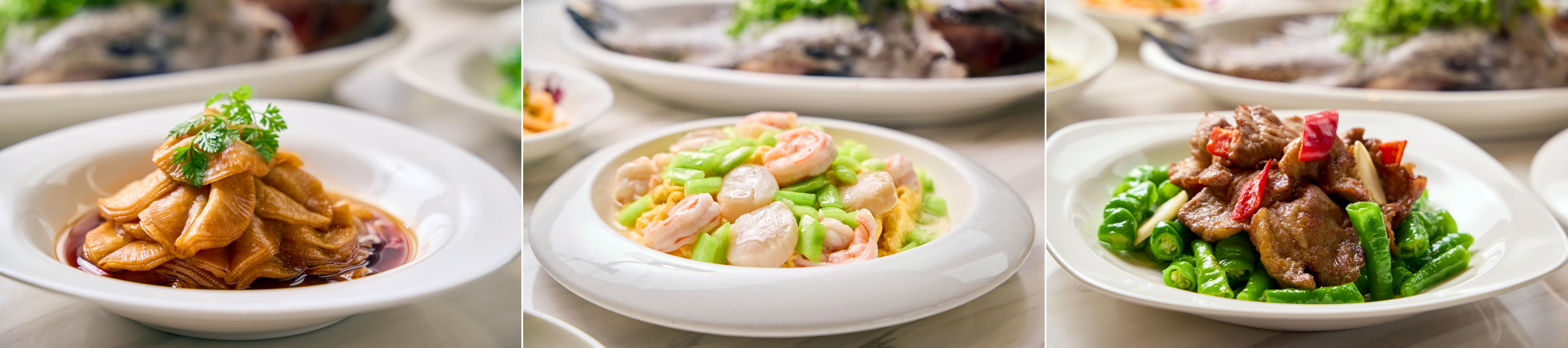 ↑圖說:「金銀蛋雨菇娃菜」結合南台灣特有的雨來菇(左);「青絲玉露龍虎斑」選用當季鮮活龍虎斑現點現煮(中)壓軸湯品「胡椒螺頭燉豬肚」(右)既暖胃又暖心。(圖片來源:高雄萬豪酒店提供)