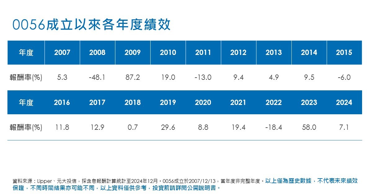 0056為台灣第一檔高股息ETF,2007年成立以來經歷多空考驗長期運營穩定,連續配息紀錄已15年,且至2024年第4季累計配息已超越發行價,對於成立時以發行價買進且長期持有的投資人,已達成零成本存股目標。