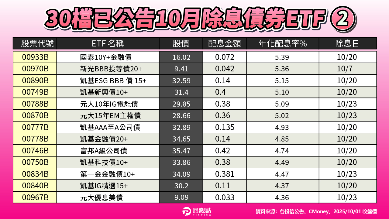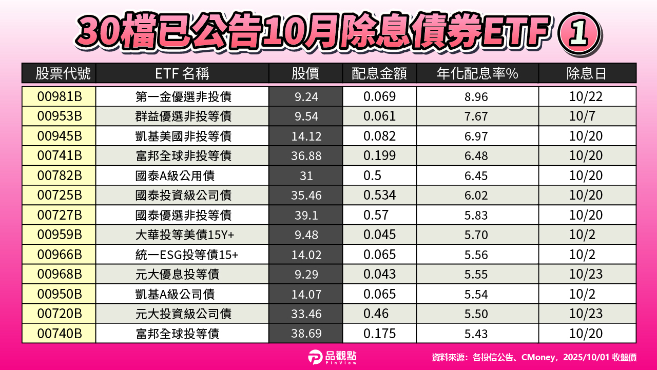 債券ETF十月除息秀,自今天起,總計有40檔將陸續登場,整體看,年化配息率落在2.5%~8.9%之間,配息率前4高,都是非投資等級債券ETF,像是第一金優選非投債(00981B),年化配息率近9%居首,其次是群益優選非投等債(00953B) 的7.67%、凱基美國非投等債(00945B) 的6.97%、富邦全球非投等債(00741B)的6.48%。