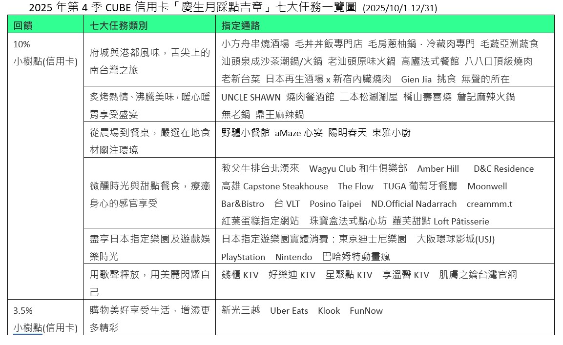 本季特別升級推出全新「慶生月踩點吉章」任務,推出「南台灣特色店家、燒肉鍋物、嚴選在地食材餐廳、牛排餐酒與甜點、日本指定樂園及遊戲娛樂、歡唱KTV,以及購物享受生活」等七大主題類別,鼓勵壽星卡友跨界體驗、為生日慶祝增添趣味與驚喜。