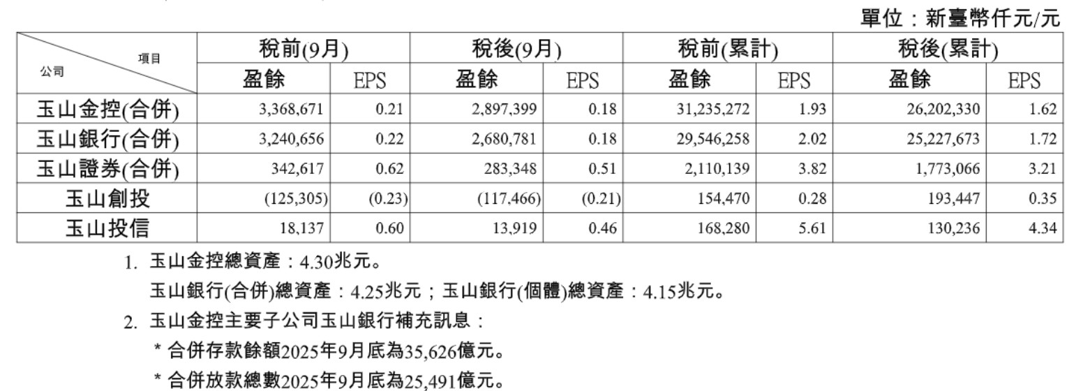 主要子公司玉山銀行,累計前三季稅後盈餘252.3億元,年增29.6%;玉山證券17.7億元;玉山創投1.9億元;金控新成員:玉山投信,貢獻1.3億元。
