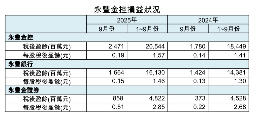 另外,永豐金也公布9月自結稅後盈餘24.71億元,累計前9月稅後盈餘205.44億元,每股稅後盈餘(EPS)1.57元,創歷史同期新高。