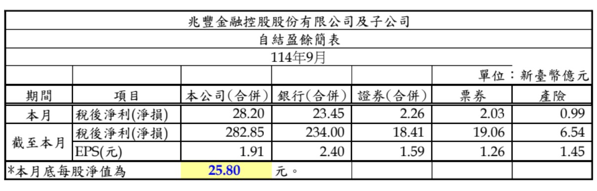 公股金控部分,兆豐金9月稅後盈餘28.2億元,累計前三季合併稅後盈餘282.85億元,每股稅後盈餘(EPS)1.91元,略低於去年同期自結的1.98元。