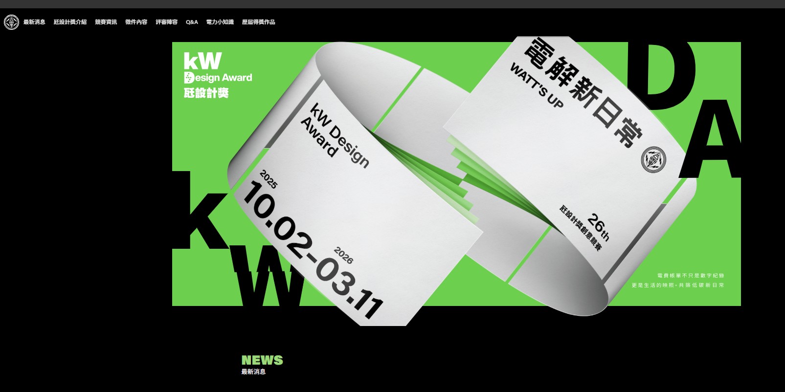 全國唯一電力設計競賽「瓩設計獎」開始徵件囉!由台電創辦的瓩設計獎,今年以「電費帳單」為設計主題,邀請參賽者用創新視角解讀帳單裡的電力密碼。本屆競賽分為傳達設計、多媒體設計及創意品設計三類,共40個獎項,首獎最高8萬元,總獎金高達71.5萬元,即日起開放徵件至明(2026)年3月11日,歡迎各路設計好手大展身手。