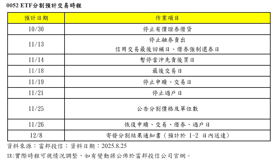 富邦投信表示,0052實際分割倍數今(9)日正式公告,11月18日將是分割前的最後交易日,11月19日至25日暫停交易,以11月19日淨值進行分割,11月26日恢復交易後,投資人可於證券APP查詢分割後股價及股數。