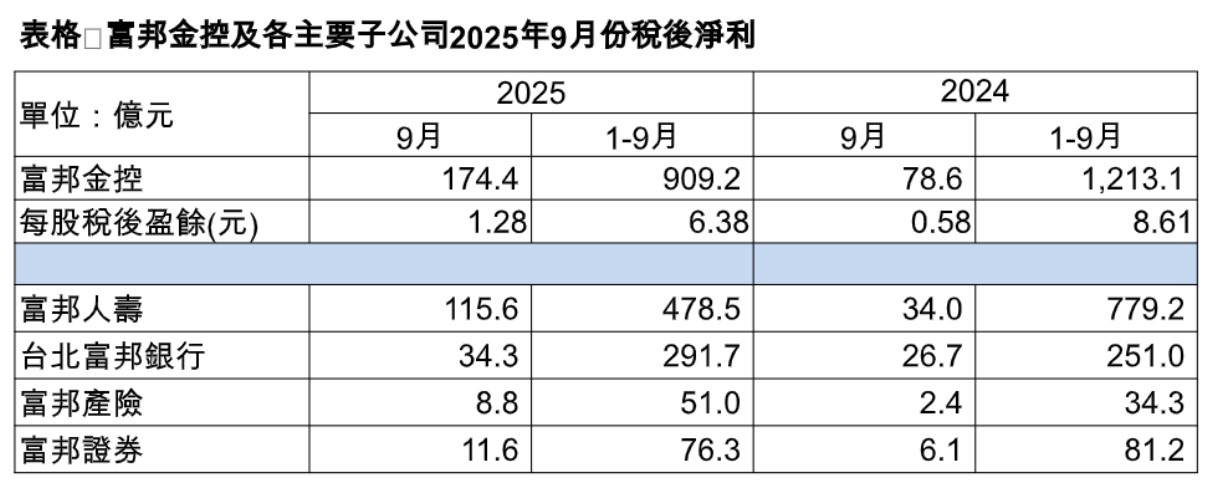 富邦金子公司富邦人壽、台北富邦銀行、富邦證券、富邦產險單9月獲利均創下歷年同期新高;台北富邦銀行累計前9月獲利亦為歷年同期新高。