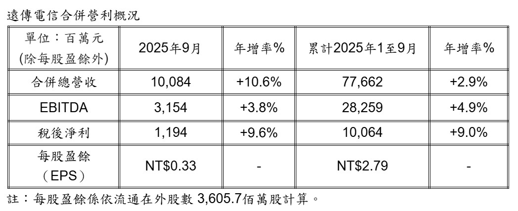 累計至今年9月,遠傳合併總營收、合併EBITDA和稅後淨利,年成長率分別為2.9%、4.9%和9%,分別達776.62億元、282.59億元和100.64億元,累計每股盈餘(EPS)2.79元。