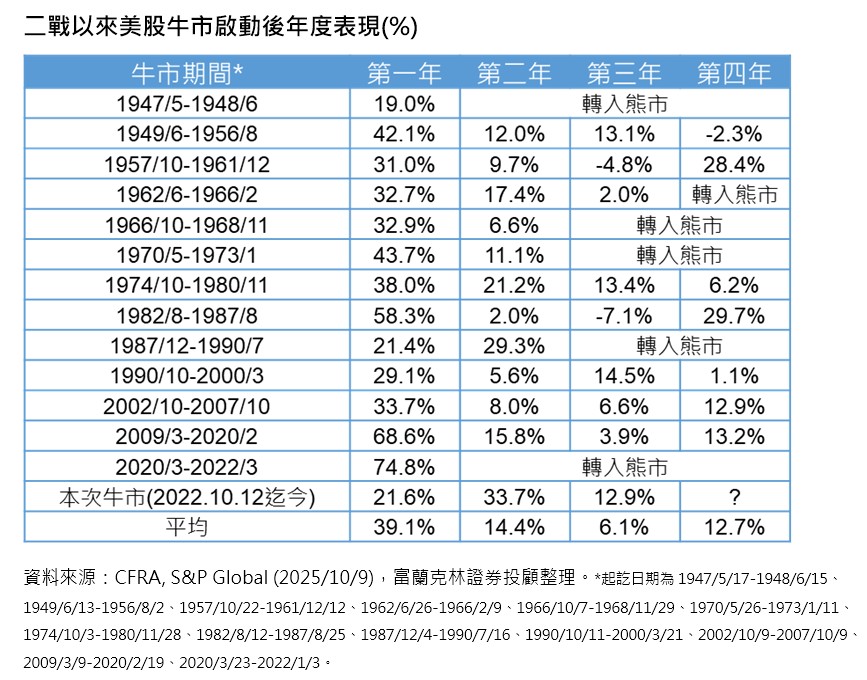 根據歷史經驗,二戰以來的歷次牛市,有6次牛市持續到了第4年,且能進入第4年的美股牛市表現出色,平均漲幅達12.9%,展現美股在熊短牛長特色下的強勁動能優勢。