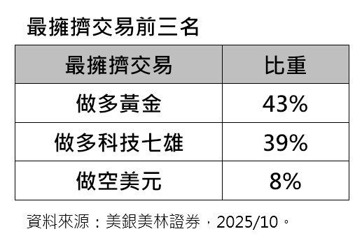 在擁擠交易方面,「做多黃金」取代「做多科技七雄」,成為最擁擠交易第一名,也反映在淨41%的經理人認為金價已高估,此外,最可能引發信用危機事件的風險來源為私募股權/債券。