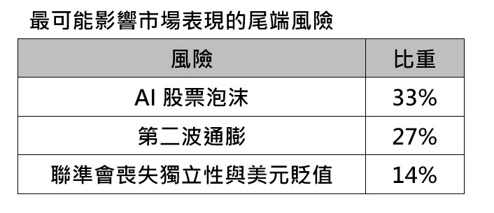 尾端風險部分,隨著AI概念股股價持續創高,「AI股票泡沫」成為經理人最為擔憂的尾端風險,認同此情況的經理人比例達33%,居次者為第二波通膨,認同比例為27%,排名第三的是聯準會喪失獨立性與美元貶值。