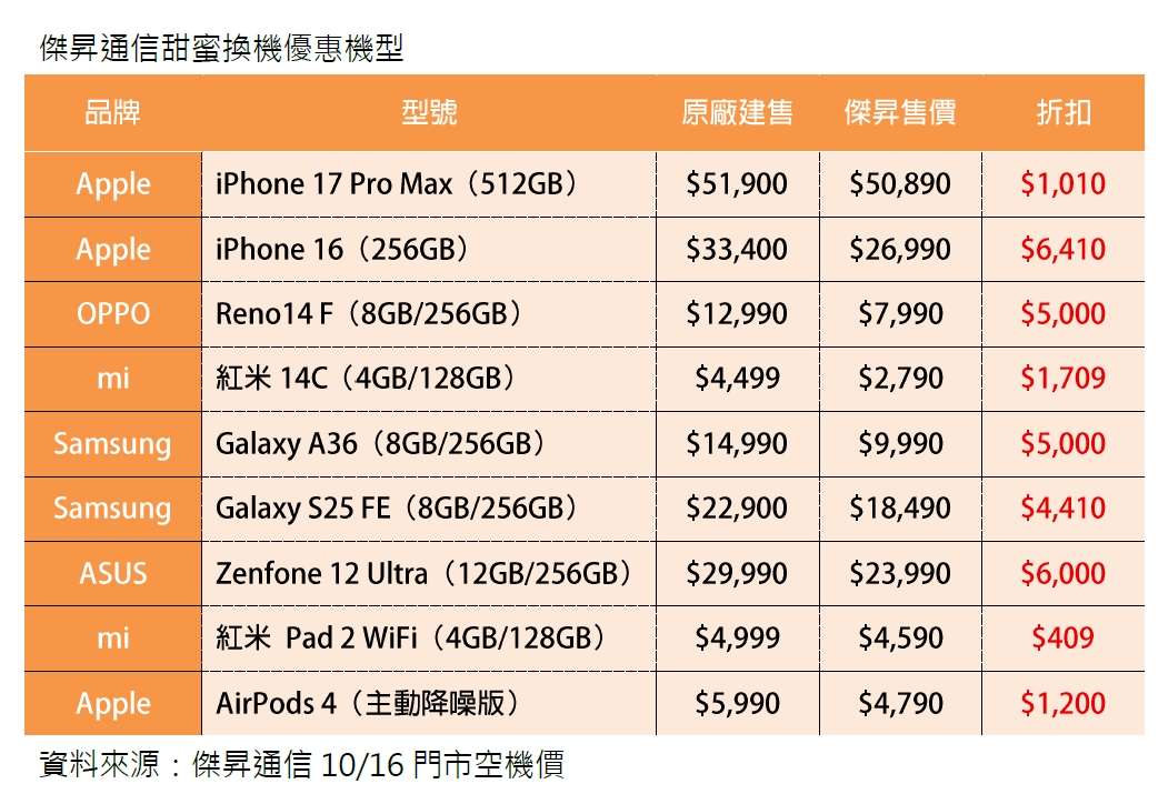 蘋果iPhone 17系列開賣即將滿月,還在等候降價的果粉們,可留意囉!傑昇通信自即日起至10月19日,將目前在蘋果官網仍需等待2至3週才能到貨的 iPhone 17 Pro Max(512GB),祭出2%折扣,現折1010元;另外,再推出多款安卓人氣手機快閃優惠,包含華碩旗艦Zenfone 12 Ultra最高現省6千元、三星Galaxy A36免萬元,以及大電量手機OPPO Reno14 F限時62折。