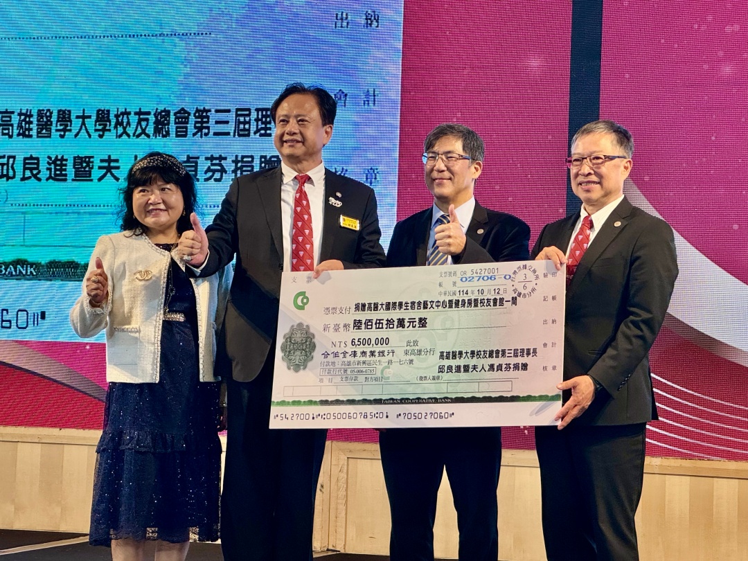 圖說:高醫大校友總會理事長邱良進(左2)、馮貞芬(左)夫婦代表校友捐贈其中一筆募款回饋母校。(圖片來源:林秀美攝影)