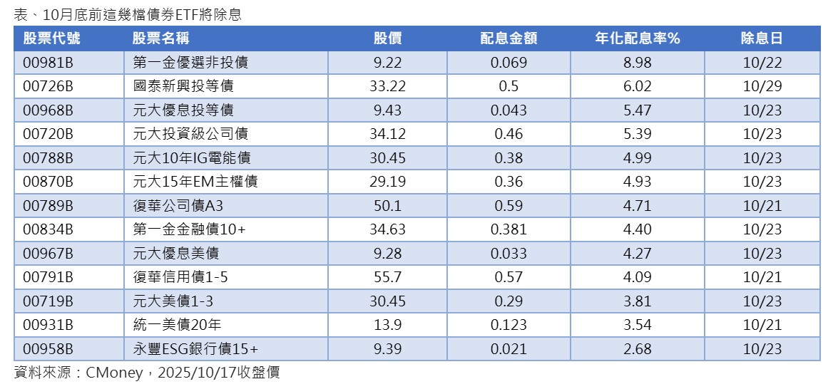 債券ETF十月除息末班車倒數 13檔年化配息率一表掌握!